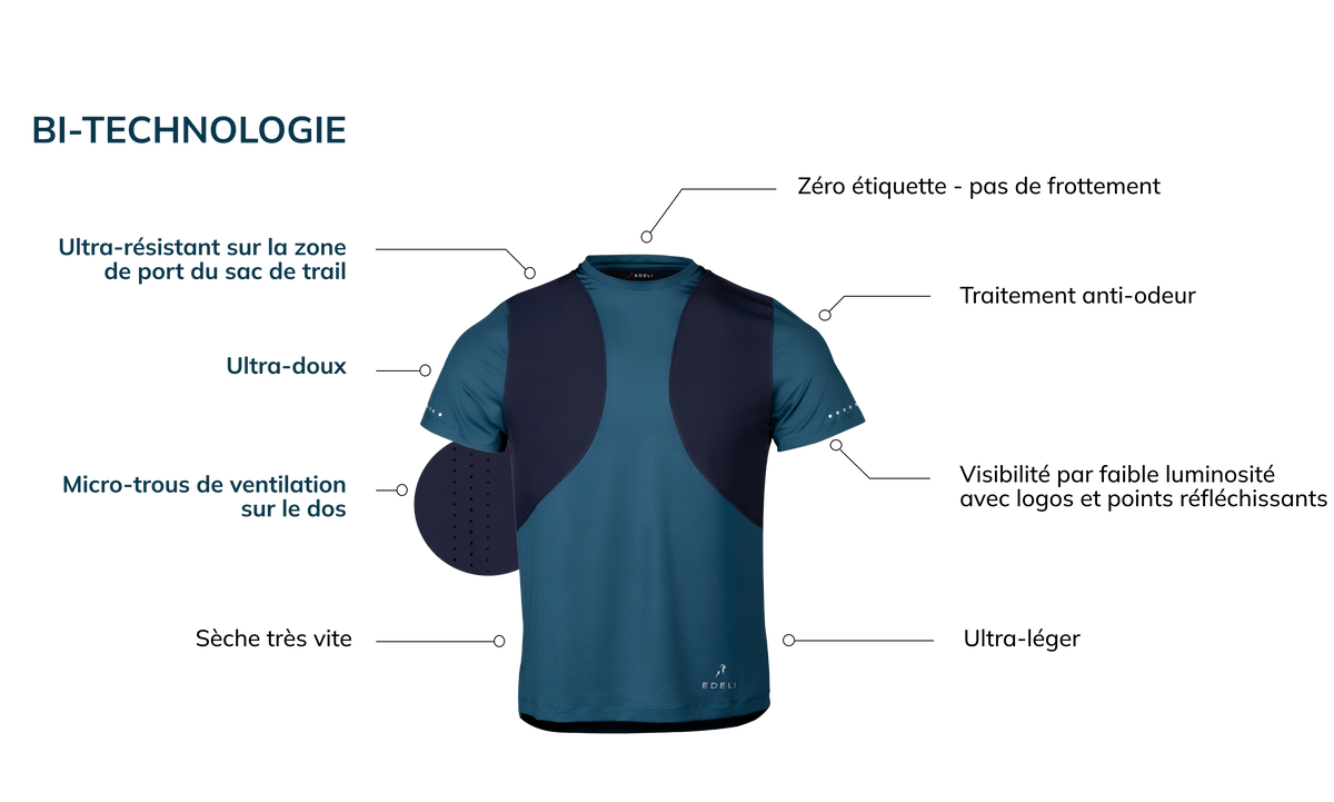 TRAIL RUNNING & RUNNING : T-shirt innovant bi-matière & bi-technologie (partie tissée et partie tricotée) pour résister aux risques d'abrasion liés au sac-de-trail